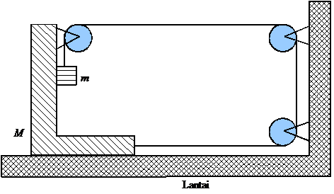 Catatan : Anggap massa M tidak bisa terguling dan tali tidak bisa mulur. Massa tali, massa katrol dan semua gesekan diabakan.