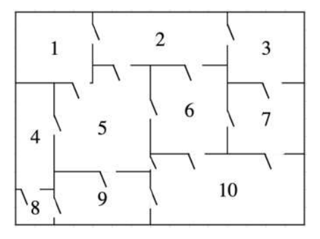 Pak Dengklek baru saja merancang sebuah denah sebuah pameran. Ia merancang denah sedemikian sehingga setiap pintu harus dan hanya dilewati sekali. Berikut adalah denah yang dibuat oleh Pak Dengklek.