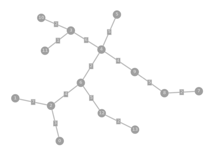 Bantulah Pak Dengklek mencari pasangan kota terjauh yang mungkin! Perhatikan bahwa pasangan kota terjauh yang dimaksud adalah 2 buah kota A dan B sehingga untuk setiap pasangan kota C dan D, C != A atau D != B, sehingga jarak dari kota A dan B di graf di bawah lebih besar dari pada jarak C dan D.
