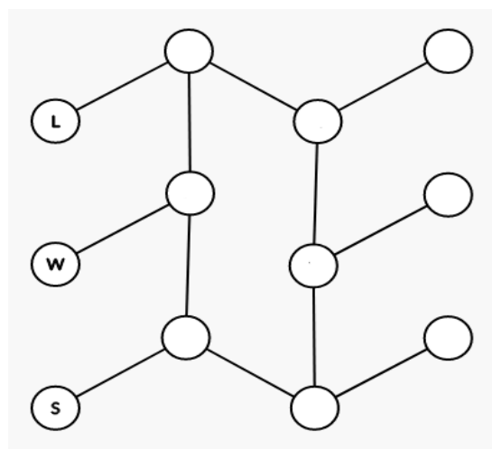 Mula-mula Pak Dengklek berada pada ruangan S. Setiap saat, dengan peluang yang sama Pak Dengklek berpindah ke ruangan lain yang bersebelahan dengan ruangan saat ini. Jika Pak Dengklek sampai pada ruangan W, Pak Dengklek langsung menang. Sebaliknya, jika sampai pada ruangan L, Pak Dengklek langsung kalah. Selain itu, Pak Dengklek akan tetap berpindah-pindah selama belum menang maupun kalah. Berapa peluang Pak Dengklek untuk menang?