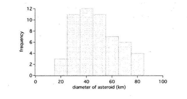An astronomer measured diameter of some asteroids. From her measurement, she created a histogram as you can find in the following. What are the median and mode of the data?