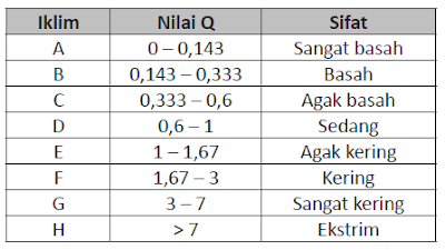 Klasifikasi iklim Schmidt-Ferguson mengukur dari jumlah bulan kering dan bulan basah sehingga rumusnya jumlah bulan kering di bagi dengan jumlah bulan basah di kali 100%.