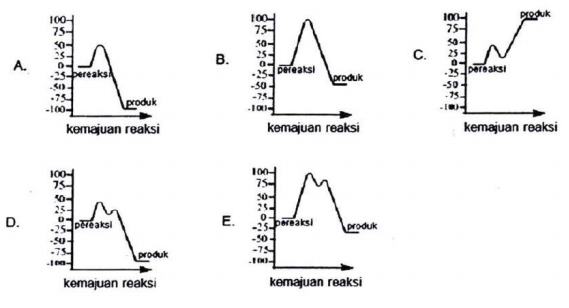 Energi aktivasi tahap 1 adalah 50 kJ.mol–1 , sedangkan perubahan entalpi reaksi keseluruhan adalah –100 kJ.mol–1 . Berdasarkan data tersebut, manakah diagram yang menggambarkan diagram tingkat energi untuk reaksi ini?