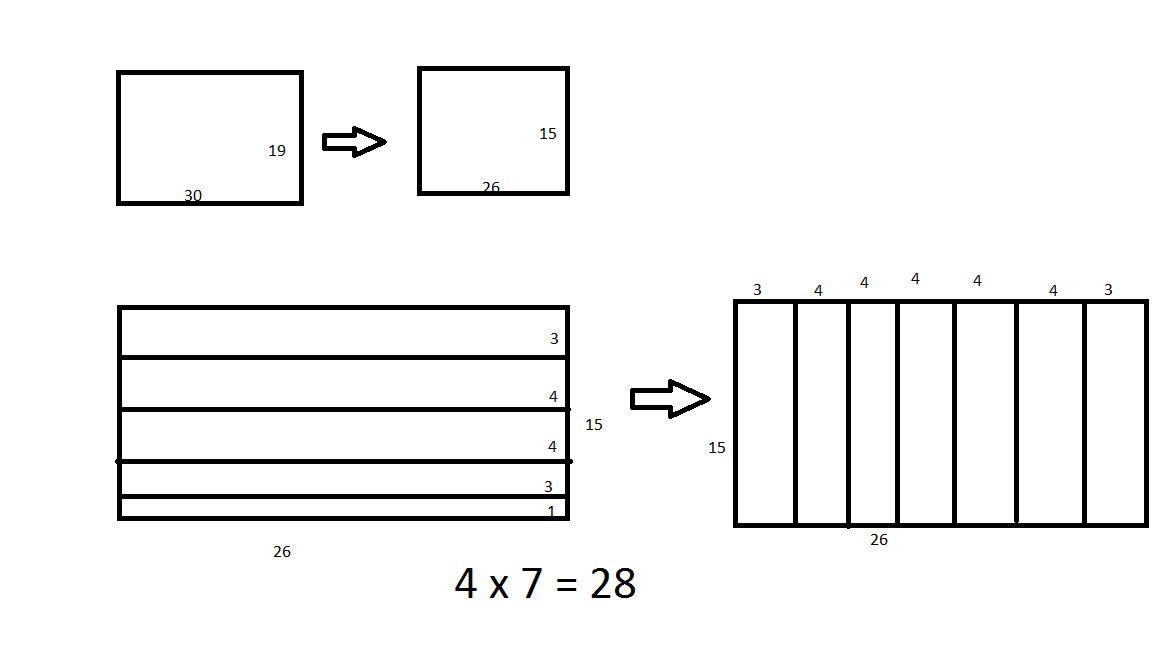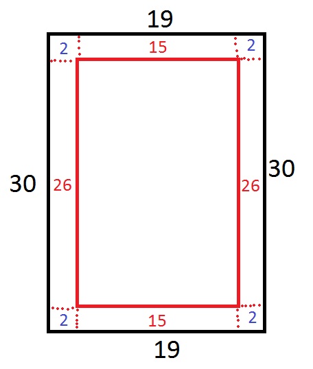 Karena ada margin kertas sebanyak 2 cm, maka ukuran kertas yang dapat ditempati perangko adalah 15cm x 26cm. Pertama, mari kita tinjau sisi panjangnya.