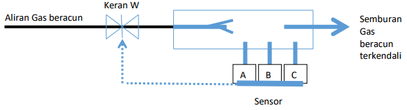 Pada sistem tersebut, semburan gas diatur dengan keran W yang dibuka atau ditutup berdasarkan sinyal dari sensor A, B dan C.