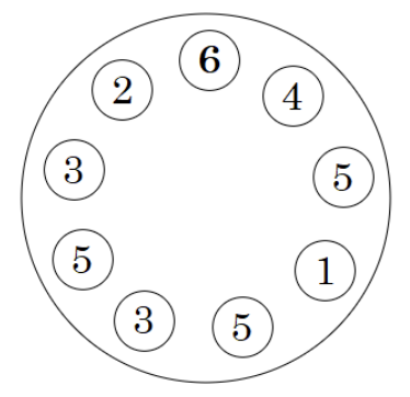 Sebagai karyawan restoran, Pak Dengklek akan mengambil seluruh piring tersebut untuk dicuci. Karena alasan keselamatan kerja, Pak Dengklek harus mengambil piring dari yang ukurannya paling besar sehingga piring yang diambil harus unit dari ukuran 6 hingga 1. Setiap berpindah dari satu meja ke meja lain yang bersebelahan membutuhkan satu langkah. Pak Dengklek hanya bisa berpindah antara dua meja yang saling bersebelahan. Berapa banyak langkah minimal Pak Dengklek untuk mengambil seluruh piring tersebut?