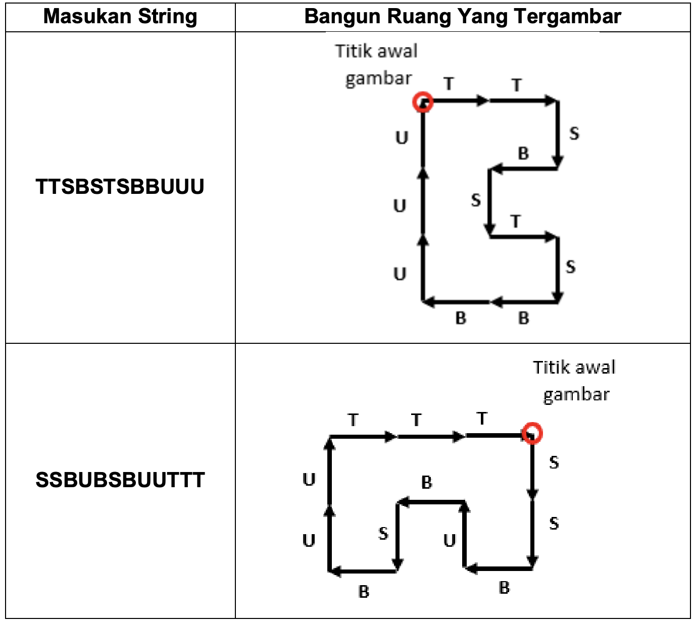 Pak Dengklek sedang membuat program sederhana yang bisa menggambar sebuah bangun ruang dari masukan sebuah string yang terdiri dari huruf-huruf "T", "U", "B", "S". Setiap membaca satu karakter pada string, program akan menggambar sebuah garis dengan panjang 1 cm yang terhubung dengan garis sebelumnya yang digambar dengan ketentuan sebagai berikut: