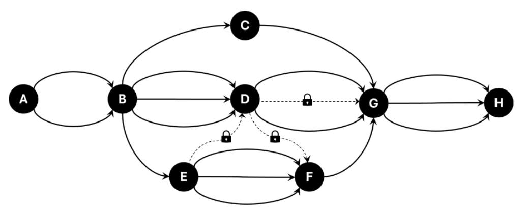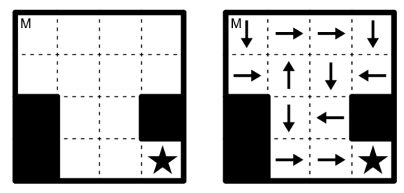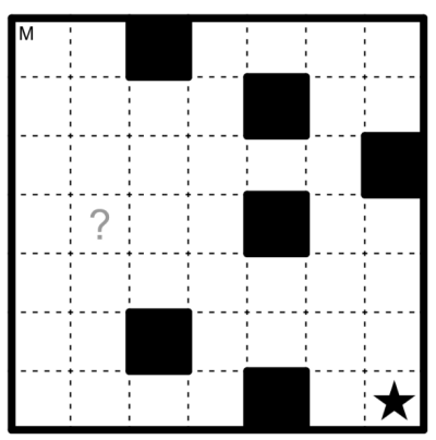 Pak Dengklek dan bebek-bebeknya akan mulai pada petak di paling kiri atas (dengan label "M") dan akan selesai pada petak di paling kanan bawah (dengan simbol bintang). Mereka dapat bergerak dari suatu petak kosong ke petak kosong lain yang bersebelahan, dengan salah satu dari empat kemungkinan arah: atas (↑), kanan (→), bawah (↓), atau kiri (←). Untuk menyelesaikan labirin, Pak Dengklek dan bebek-bebeknya harus mengunjungi semua petak putih tepat satu kali.