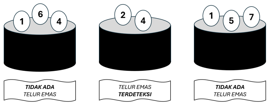 Sebagai contoh, berikut adalah ilustrasi mesin pendeteksi telur apabila telur 2 dan 3 adalah telur emas. Perhatikan bahwa ini adalah contoh, sehingga mungkin saja telur emas yang sesungguhnya merupakan pasangan telur yang lain.