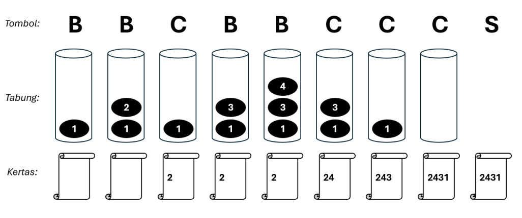 Jika Pak Dengklek memiliki N = 6 koin dan melakukan penekanan tombol secara berurutan sebagai berikut: "BBCBCBBCCCBCS", maka apakah isi dari kertas hasil cetakan pada akhirnya?