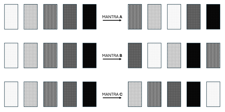 Dua atau lebih mantra dapat juga dilakukan secara berurutan. Misalnya, PQ([i, j, k, l, m]) artinya mantra Q diterapkan pada urutan kartu [i, j, k, l, m], kemudian dilanjutkan dengan penerapan mantra P pada urutan kartu hasil mantra Q.