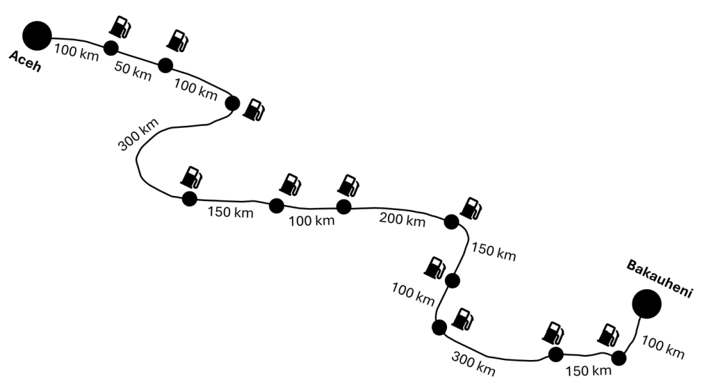 Pak Dengklek akan memulai perjalanannya di kota Aceh dengan tangki bahan bakar yang penuh. Apabila tangki bahan bakar mobil Pak Dengklek penuh, mobil Pak Dengklek dapat menempuh perjalanan hingga sejauh 500 km. Pak Dengklek dapat berhenti pada beberapa pom bensin yang tersedia (yang diberi label titik) untuk mengisi bahan bakar mobilnya hingga penuh kembali.