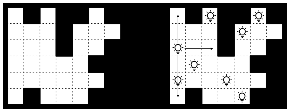 Agar ruang bermain bebek-bebeknya tidak gelap, Pak Dengklek ingin memasang beberapa lampu pada beberapa petak putih. Apabila suatu petak dipasang oleh sebuah lampu, maka petak-petak yang terhubung berurutan tanpa terhalang oleh dinding apa pun secara vertikal (atas-bawah) maupun horizontal (kiri-kanan) dari petak tersebut akan terang. Pak Dengklek ingin seluruh petak putih terang.
