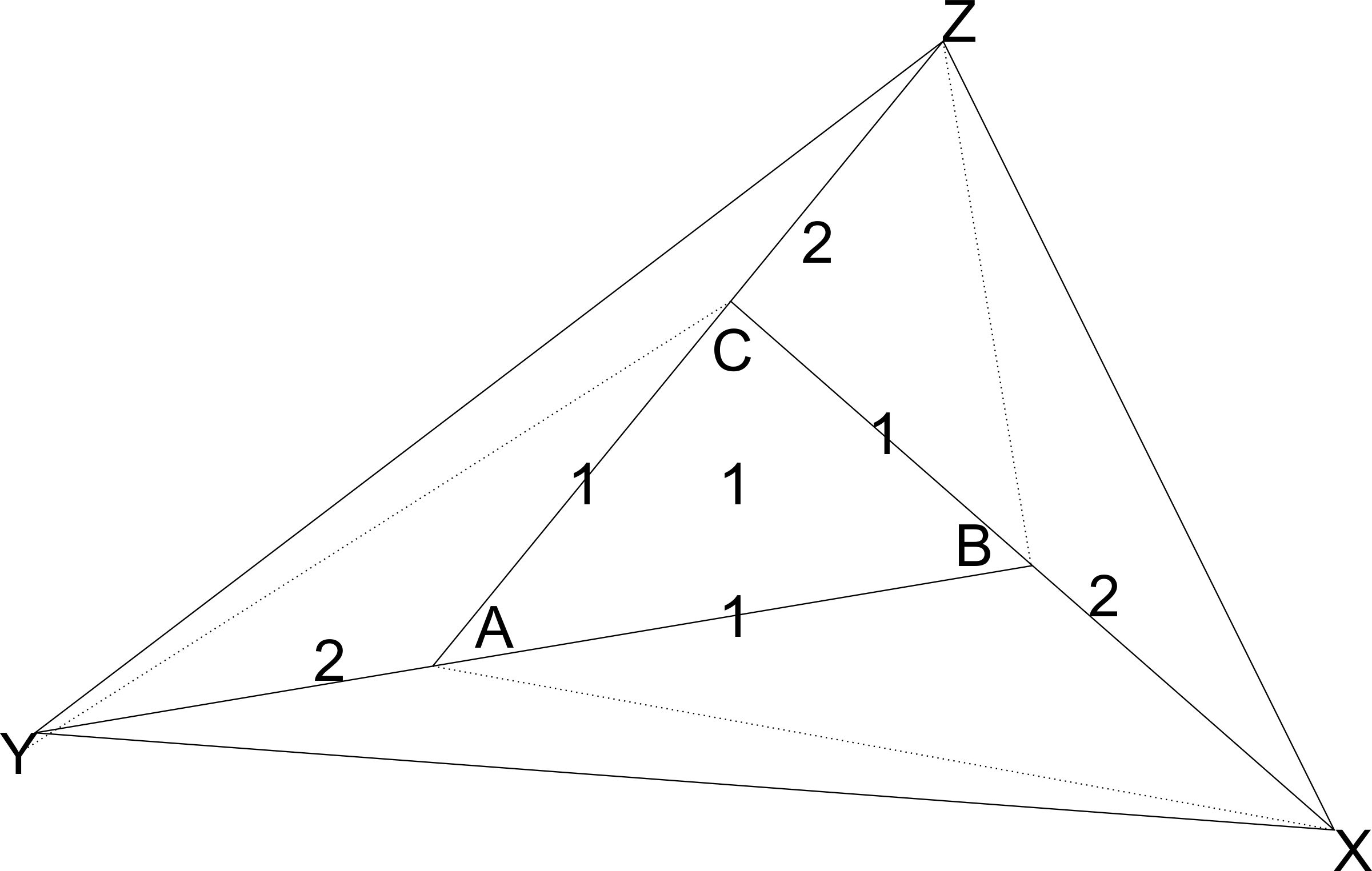 Pada segitiga ABC, titik-titik X, Y, dan Z berturut-turut terletak pada sinar BA, CB, dan AC sehingga BX = 2BA, CY = 2CB, dan AZ = 2AC. Jika luas adalah 1, maka luas