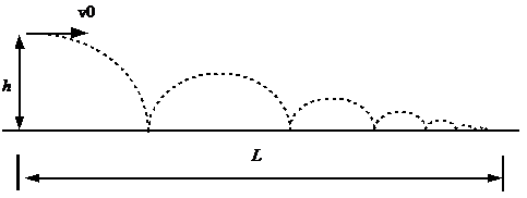 Sebuah bola pada ketinggian h dari permukaan lantai, ditembakkan secara horizontal dengan kecepatan v0. Bola mengenai lantai dan memantul kembali. Proses tumbukan tersebut berlangsung elastik sebagian dengan koefisien restitusi e. Bola akan terus memantul berkali-kali sampai akhirnya tidak dapat memantul lagi. Tentukan kapan (T) ini terjadi. Berapakah jarak horizontal L, yang ditempuh bola sampai keadaan ini?