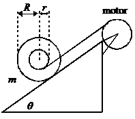 Sebuah yoyo dengan massa m, jari-jari dalam r dan jari-jari luar R diletakkan di atas sebuah bidang miring dengan sudut kemiringan . Momen inersia yoyo terhadap pusat massanya adalah ½mR2. Di ujung atas terdapat sebuah motor yang akan digunakan untuk menggulung benang dari yoyo. Bidang miring licin dan posisi motor diatur sedemikan rupa sehingga benang sejajar dengan bidang miring (lihat gambar). Mula-mula semua sistem dijaga diam. Saat yoyo dilepas, motor mulai bekerja dengan kecepatan putar diatur sedemikian rupa sehingga pusat massa yoyo tidak mengalami perubahan posisi. Tentukan berapa besar daya motor sebagai fungsi waktu agar dapat memberikan keadaan ini.