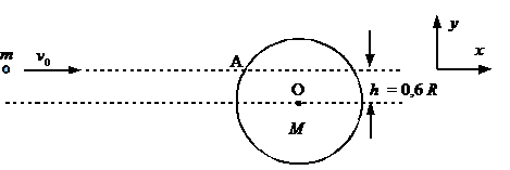 Sebuah massa titik m bergerak dengan kecepatan v0 di atas lantai licin dan menabrak sebuah piringan (massa M = 3m berjari-jari R). Tumbukan terjadi di titik A pada jarak h = 0,6 R dari garis horizontal yang melalui pusat piringan (lihat gambar). Tentukan vektor kecepatan akhir (dalam arah x dan y) kedua massa!