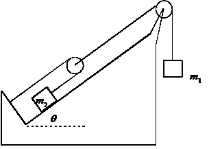 Catatan: Massa tali dan katrol diabaikan dan tidak ada gesekan antara massa m2 dengan bidang miring.