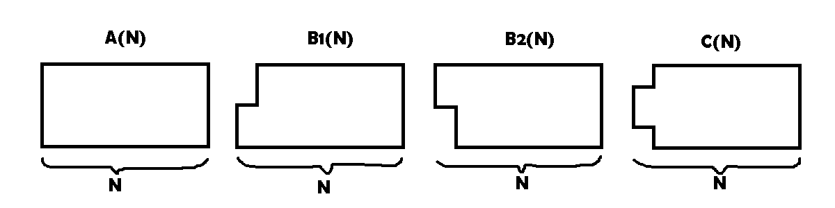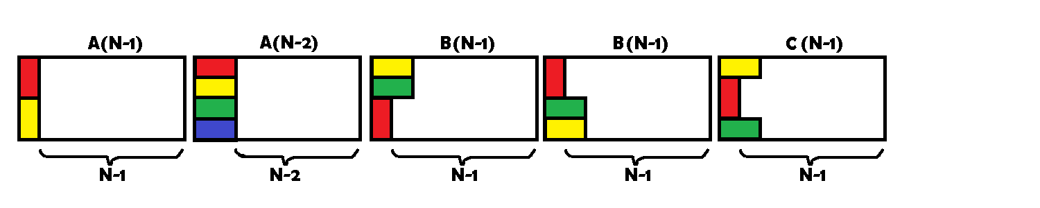 - A(N) adalah banyaknya pengubinan untuk lantai 4xN yang utuh (tidak ada bolong, perhatikan definisi selanjutnya)