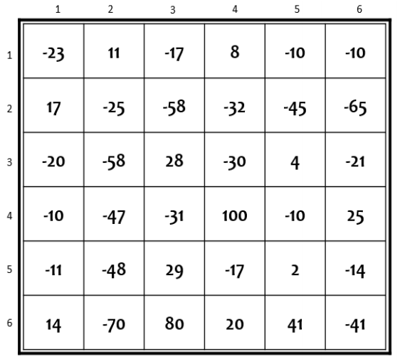 Pada permainan ini, ksatria hanya bisa berjalan ke arah timur atau selatan (tidak bisa melangkah secara diagonal). Ksatria tidak pernah boleh kehabisan kekuatan (kekuatan bernilai negatif atau 0) selama permainan berlangsung, termasuk pada awal permainan, dan semua ramuan pada petak-petak yang dilewati ksatria harus diminum. Tentukan jumlah kekuatan awal minimum yang harus dimiliki ksatria pada awal permainan agar ksatria tersebut dapat menyelamatkan sang putri dan memenangkan permainan!