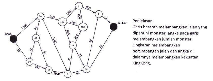 " Setiap persimpangan jalan dijaga oleh Kingkong berkekuatan X sehingga Anab memerlukan energi minimal sebesar X untuk mengalahkan KingKong (jika energinya habis maka Anab akan mati)."