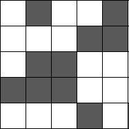 Kotak-kotak pada gambar berikut merepresentasikan ruangan-ruangan. Sebuah ruangan bertetangga dengan empat ruangan di sebelah kiri, kanan, atas dan bawahnya kecuali ruangan yang letaknya di pinggir atau di pojok. Di setiap ruangan terdapat sebuah lampu dan sebuah saklar yang terhubung ke lampu tersebut dan lampu di ruangan tetangganya. Jika sebuah saklar ditekan, maka lampu yang terhubung dengannya akan berubah dari nyala menjadi padam atau sebalikya. Dalam gambar di bawah ini, kotak berwarna putih menyatakan ruangan dengan lampu yang menyala, sedangkan kotak berwarna hitam menyatakan ruangan dengan lampu yang padam.