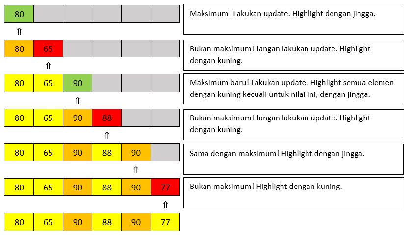 Algoritma ini selalu mengeluarkan output yang kita inginkan, yaitu banyaknya elemen yang dilabeli dengan warna jingga. Mengapa? Karena saat kita pertama kali menemukan elemen termaksimum (contohnya pada baris ketiga di gambar), yaitu , terdapat beberapa properti yang terjamin kebenarannya: