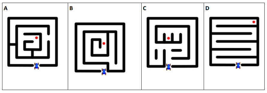 Dengan cara yang sama, tentukan maze-maze [A, B, C, D] yang robotnya dapat mencapai pintu keluar dari titik bulat.