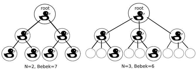 Pak Dengklek akan menaruh bebek mulai dari akar pohon, dan hanya kandang yang merupakan daun yang boleh kosong. Contoh gambar pohon N-ary seimbang penuh dengan N=2 dan N=3 diberikan sebagai berikut.