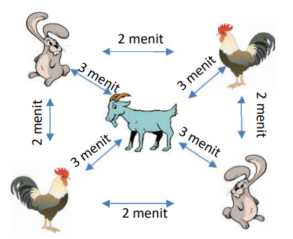 waktu berjalan Kwek dari kandang ayam ke kandang kelinci dan sebaliknya adalah 2 menit