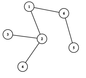 [Gambar: Pohon (tree graph) dengan 6 node (kota 1-6). Sisi-sisi: 1-2, 1-6, 2-3, 3-4, 2-4, 6-5. Kota 1 di atas, kota 6 di kanan atas, kota 3 di kiri bawah, kota 2 di tengah, kota 4 di bawah, kota 5 di kanan bawah.]