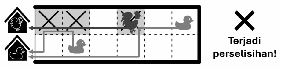 Pada contoh keempat, perhatikan bahwa rute yang dilalui bebek pasti akan pernah bersilangan dengan rute ayam sehingga terjadi perselisihan.
