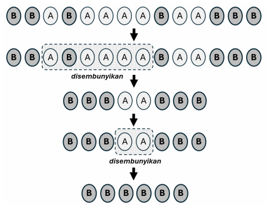 Pak Dengklek akan menata ulang telur-telur sisanya menjadi satu kesatuan dari kiri ke kanan tanpa mengubah urutannya.