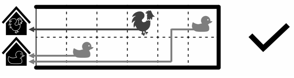 Sedangkan berikut ini adalah ilustrasi kepulangan hewan yang mengakibatkan perselisihan karena terdapat 3 petak yang pernah dilalui oleh setidaknya seekor ayam dan setidaknya seekor bebek.